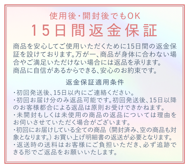 ※初回商品の到着後より解約が可能です。解約をご希望のお客様は、お買い上げ明細書に記載されている次回発送予定の10日前までにお電話(0120-026-232/営業時間 9:00~18:00※土日祝日を除く)にてご連絡ください。